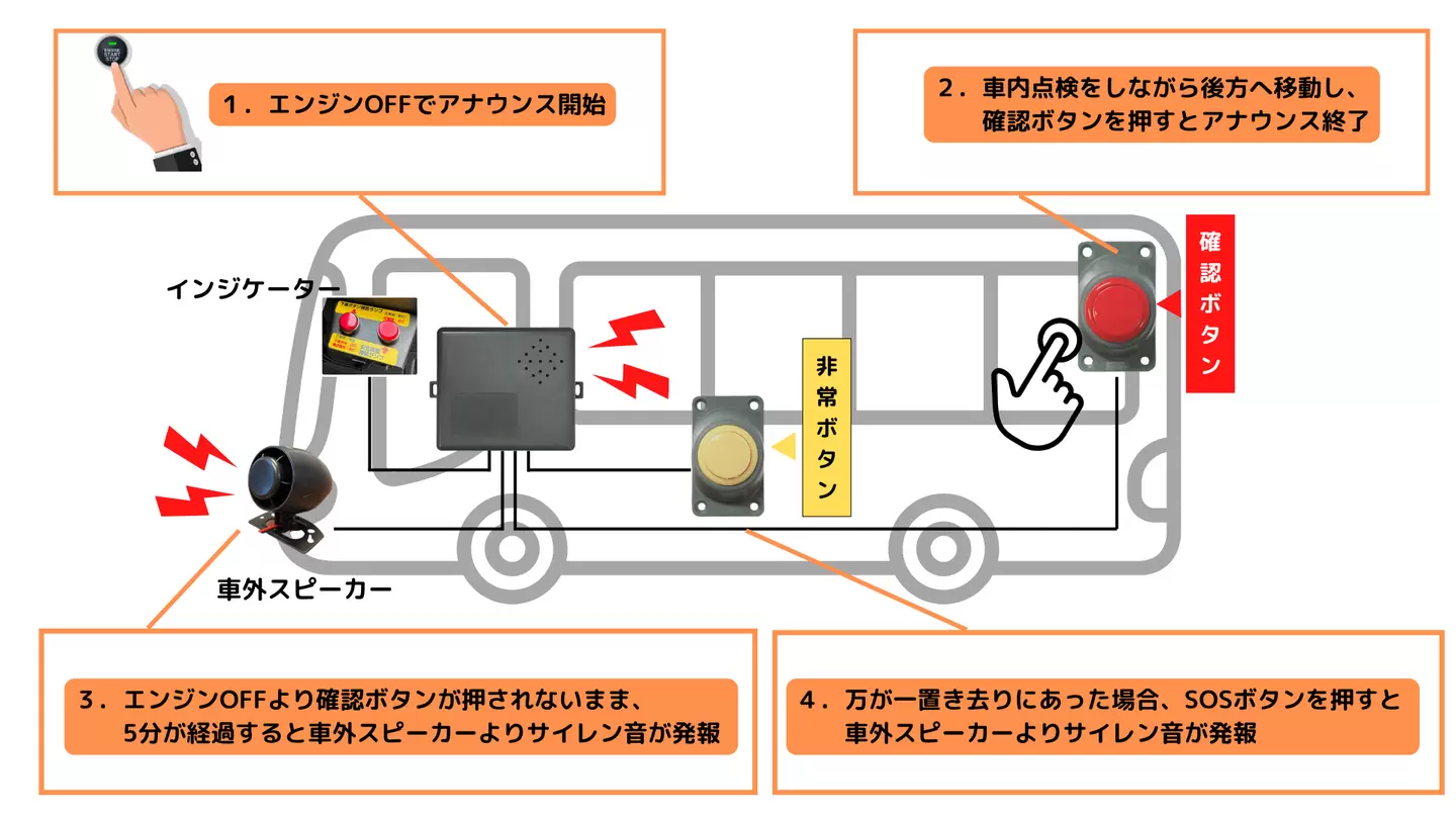 - 取り残された園児がいなければ、車内後方にある「確認ボタン」を押して確認完了